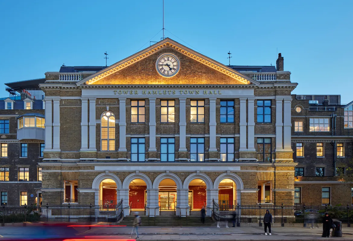 Tower Hamlets Town Hall combines the refurbishment of the former Royal London Hospital with a new-build extension to create 26,700 m² of civic office space with capacity for 2,470 staff. The project includes contemporary workspaces, meeting rooms, welfare facilities, a café, council chamber, and public-facing ground floor spaces designed to bring council services together in one place.